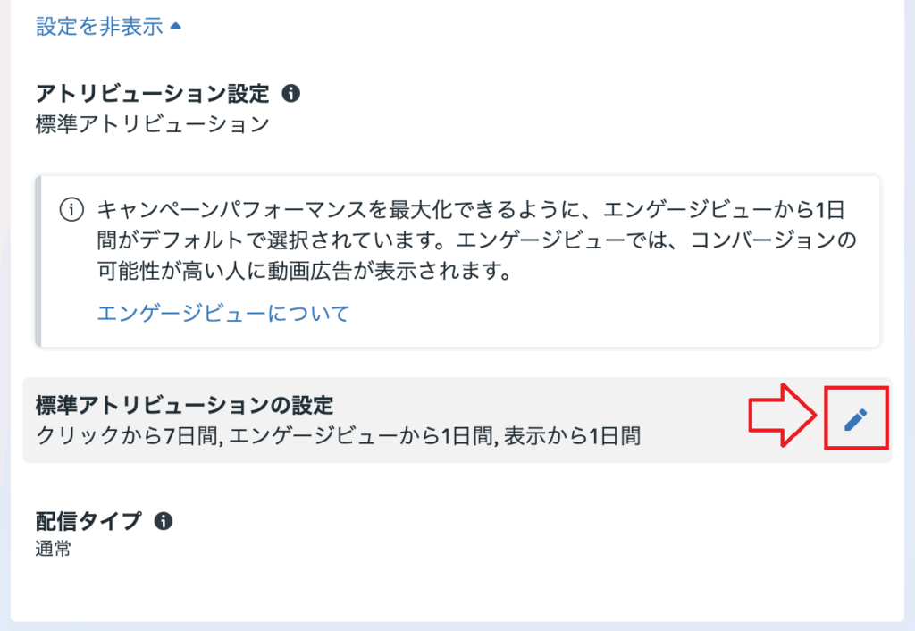 ②「標準アトリビューションの設定」の右端にある「えんぴつマーク」をクリックする。
