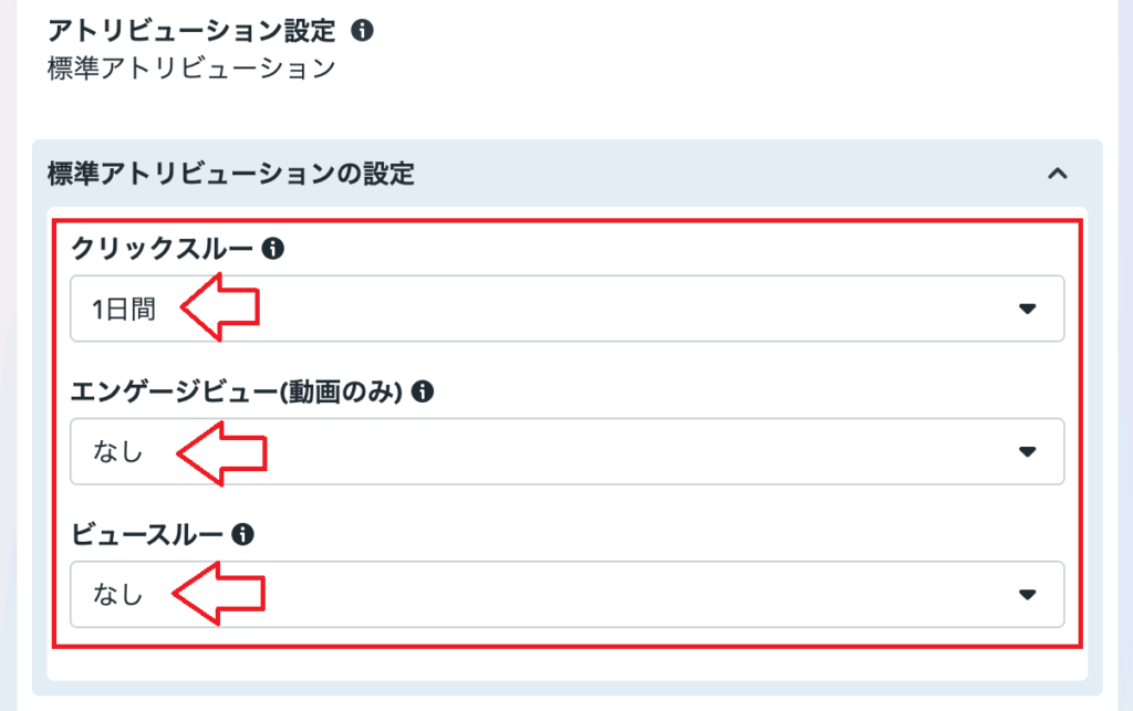 ③「クリックスルー」の箇所を「1日間」に設定して、その他の設定を「なし」に設定する。