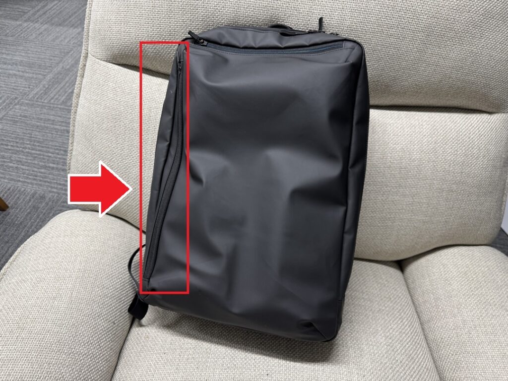 デザイン重視でいくなら今の位置がベストなのは明らかなのですが、保安検査でリュックをチェックしてもらう時にここのチャックを開けっ放しで預けてしまって、受け取る際に派手にべろーんとしてしまいました。^^;