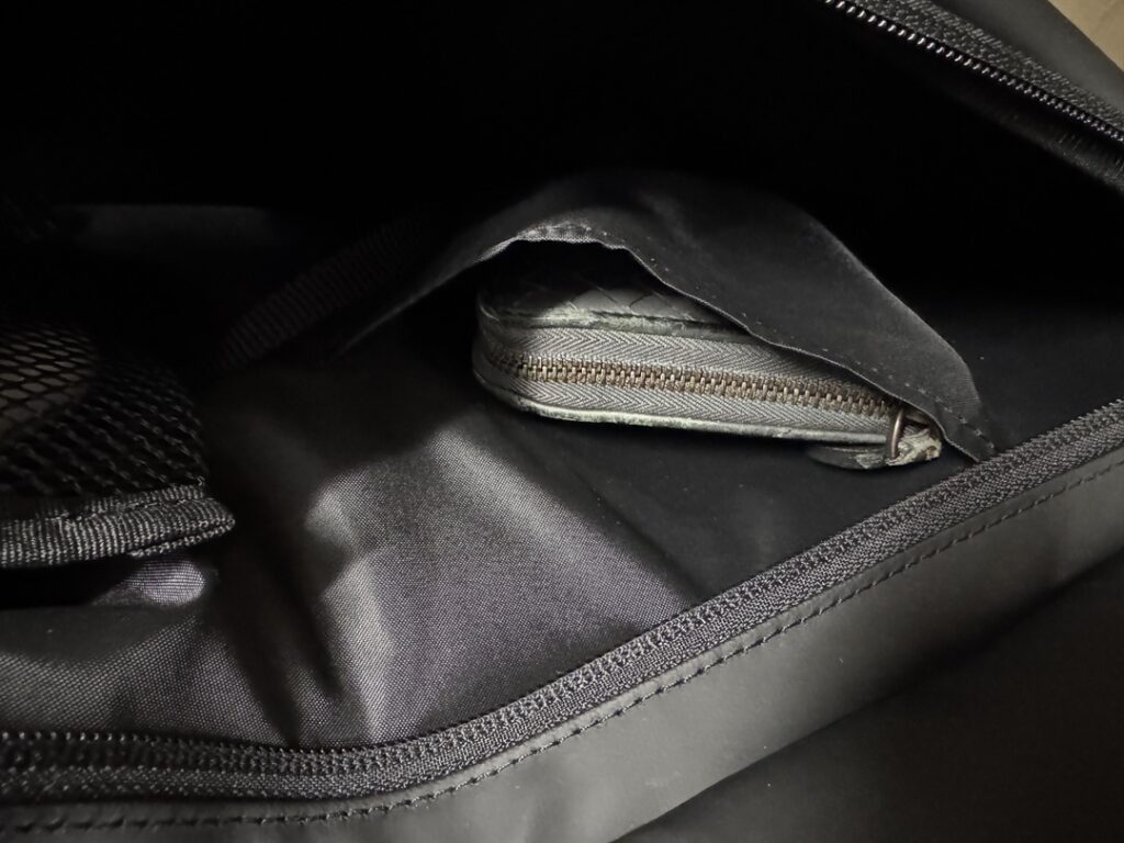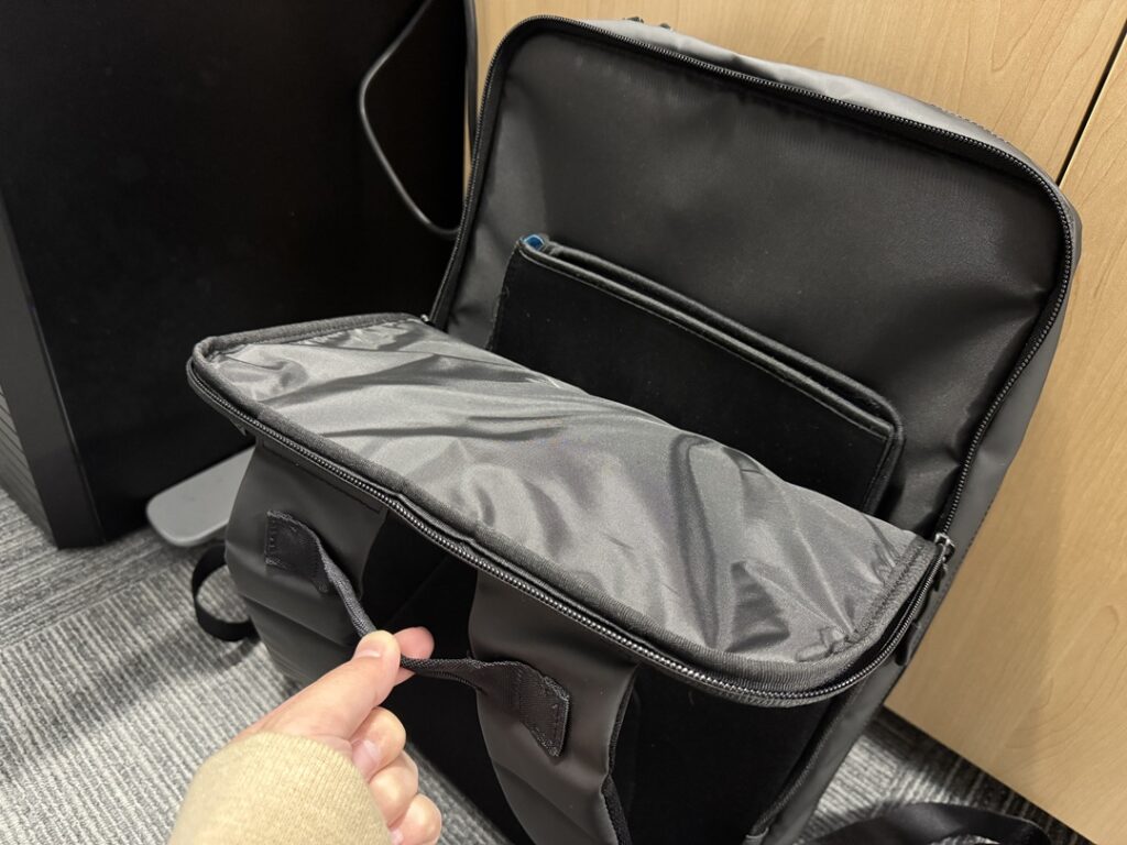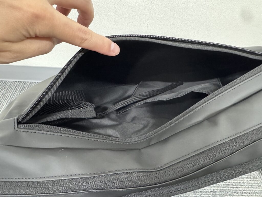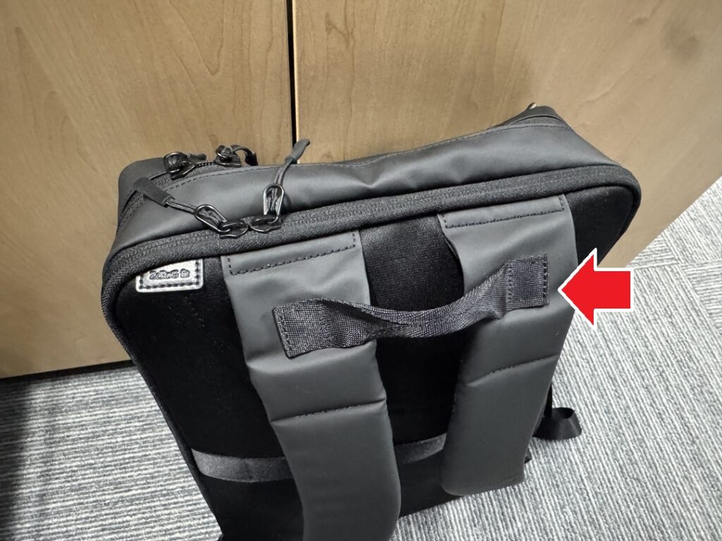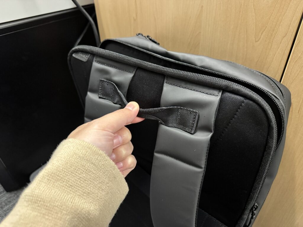 持ち手がある事は僕にとって重要ポイントだったのでめちゃくちゃありがたいのですが、後ろ側のチャックを開けた状態でこの持ち手を持ってしまうとべろ~んってなってしまうんです。。汗