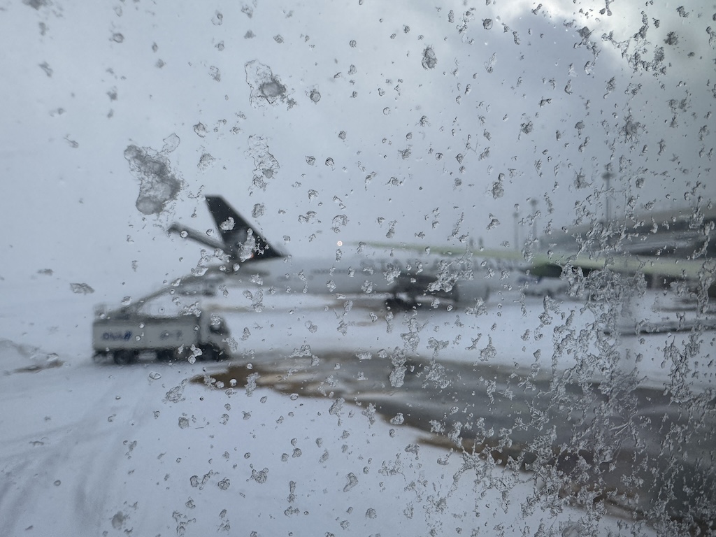 そして、無事に飛行機に乗った後、何事もなく滑走路まで進んでいたのですが、滑走路まで移動する短時間で雪が翼の上に積もったらしく一旦駐機場に戻って雪落としするとのこと…。